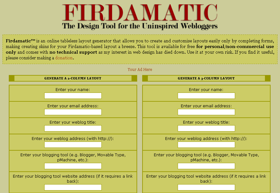 Firdamatic is an online tableless layout generator that allows you to create and customize layouts easily only by completing forms, making creating skins for your Blogger-based layout a breeze. This tool is available for free for personal/non-commercial use only and comes with no technical support. So use it at your own risk.